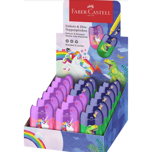 ASCUTITOARE PLASTIC DUBLA CU CONTAINER UNICORNI SI DINOZAURI FABER-CASTELL