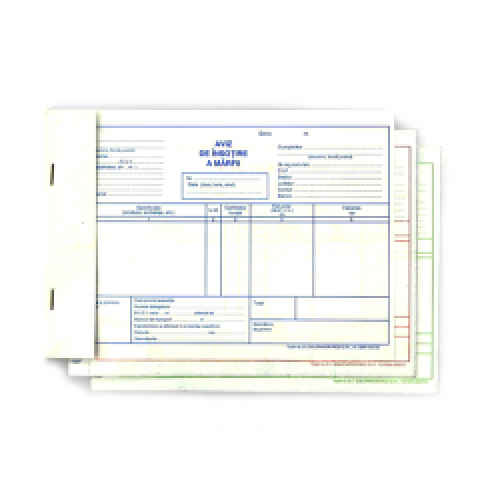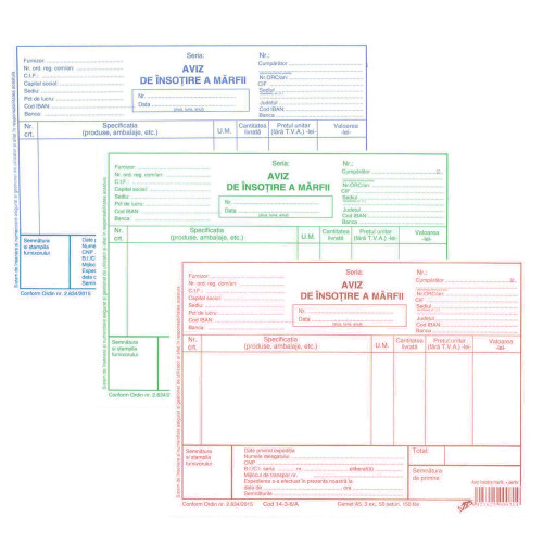 Aviz de insotire a marfii in format A5, in 3 exemplare. Hartia este autocopiativa, alba. Printarea este in limba romana cu rosu/verde/albastru. Avizele de insotire a marfii sunt formulare tipizate prinse in carnete cu 150 file (50 seturi). Dimensiuni fila: 14.8 x 21.1 cm.