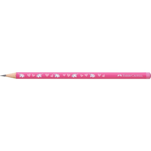 Creion grafit HB Unicorni Faber-Castell fara guma, forma ergonomica triunghiulara. Lipirea speciala (SV) previne ruperea minei. Vopsea pe baza de apa. Mina creion HB. Corp roz cu print unicorni.
