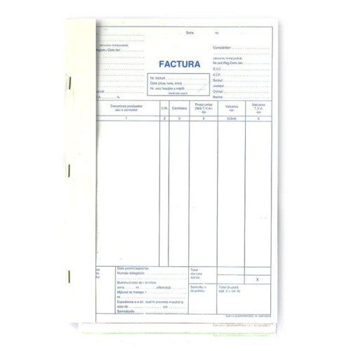 Factura autocopiativa este un formular tipizat, ce are formatul A4 cu orientare portret. Blocul de facturi contine un numar de 150 file, impartite in 50 seturi a cate 3 exemplare, neinseriate. Formularul este tiparit doar fata, color (albastru, rosu si verde/set), pe hartie autocopiativa de 55g/mp. Blocul de facturi are coperta din carton duplex alb, este capsat si are perforatii pentru o detasare mai usoara a fiecarui exemplar.