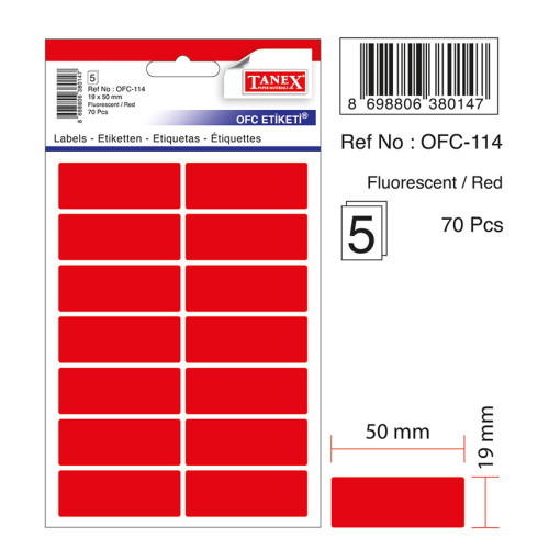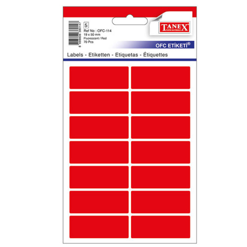 Etichete autoadezive Tanex. Hartie FSC Mix certificata. Dimensiuni eticheta: 19 x 50 mm. Forma dreptungiulara, colturi rotunjite. Culoare: rosu. Ambalare: 70 etichete/set (5 folii x 14 etichete/folie).