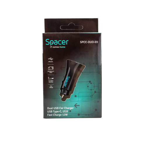 ALIMENTATOR auto SPACER Fast Charge 12W, 5V/2.4A max, putere 12W, 1 x USB + 1 x USB Type-C, pt. bricheta auto, black, "SPCC-DUO-03" (timbru verde 0.18 lei)