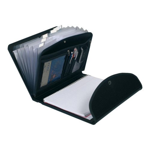 Mapa din plastic cu 6 compartimente indexate si etichetate. Include bloc notes, suport pentru pix, buzunare cu fermoar dintre care unul cu intaritura pentru depozitare tableta. Dimensiune: 255 x 330 mm.