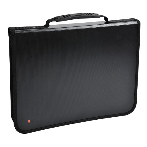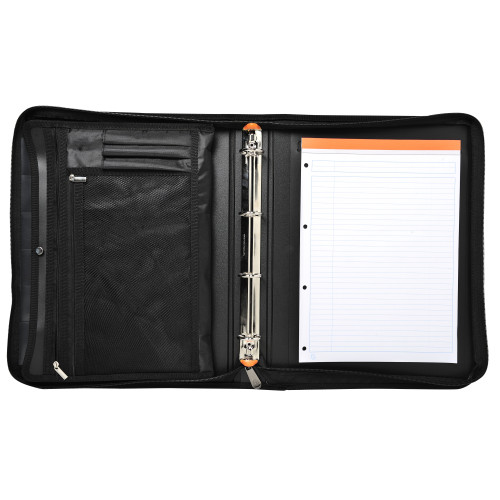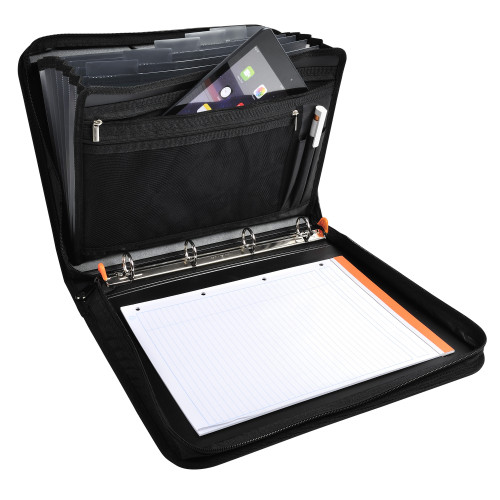 Mapa din plastic reciclat, rigid de 2 mm, cu 4 inele. Inchidere cu fermoar si maner pentru transport. Include bloc notes, suport pentru pix, 2 buzunare cu fermoar dintre care unul cu intaritura pentru depozitare tableta, 2 compartimente pentru documente. Dimensiune: 270 x 360 mm.
