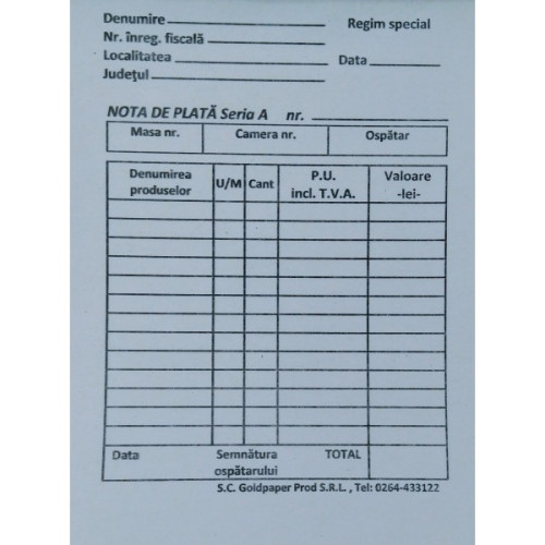 Nota plata format A6 , 100 de file de hartie alba de 50-55 g/mp, printate in limba romana, cu negru, pe o singura fata. Filele sunt lipite si capsate pe latura scurta, iar pentru desprinderea usoara vin prevazute cu perforatii langa cotor.