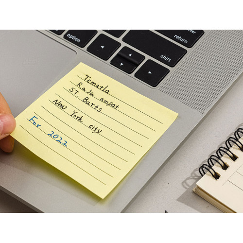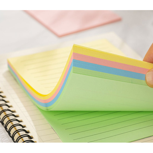Notes adeziv din hartie, liniat, 4 culori pastel asortate: roz, verde, galben, albastru. Dimensiune: 76 x 101 mm. Ambalare: 4 culori x 25 file/culoare. Ideale pentru organizare, atat acasa cat si la birou.