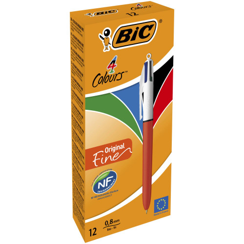 Pix Bic 4 culori. Cu o simpla apasare de buton se alege culoarea dorita: albastru, verde, rosu sau negru. Cele patru rezerve contin o cerneala de calitate, cu uscare rapida. Corpul pixului este confectionat din material plastic, prevazut cu clip rezistent. Grosimea varfului este de: 0.8 mm, iar linia de scriere este de 0.35mm.