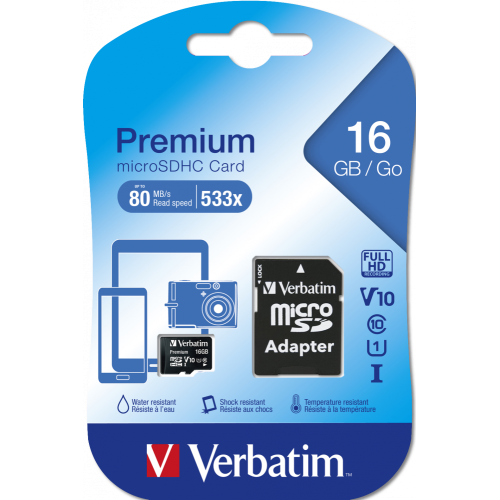 MEMORIE microSD CARD VERBATIM 16GB CLASA 10, ADAPTOR INCLUS "44082" (TIMBRU VERDE 0.03 LEI)
