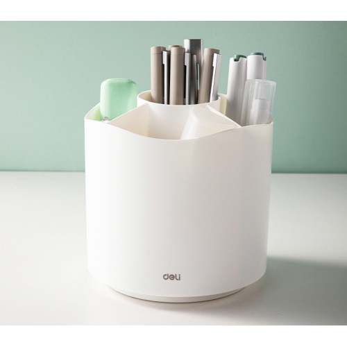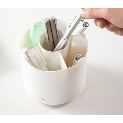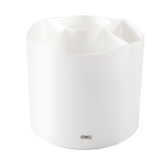 Suport rotativ Deli cu 5 compartimente, pentru instrumente de scris, de culoare alba, realizat din plastic rezistent usor de curatat. Se roteste la 360° facilitand accesul la compartimente. Capacitate mare de stocare. Dimensiuni: 12.3 x 12.3 x 12.4 cm.