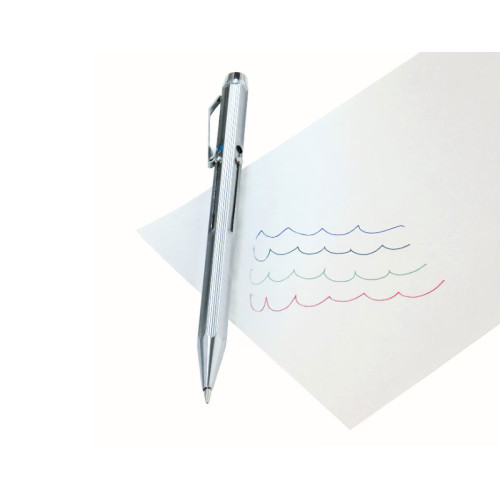 Pix metalic rezistent, cu aspect modern, care ofera posibilitatea de a scrie pe rand cu oricare dintre cele patru culori de paste incluse: albastru, rosu, verde, negru. Corp din metal cu striatii pentru a preveni alunecarea degetelor. Grosime scriere 1 mm.