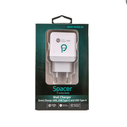 ALIMENTATOR retea SPACER Quick Charge 20W, USB Type-C PD+ USB Quick Charge, "SPAR-DUOQ-01" (timbru verde 0.18 lei)