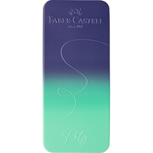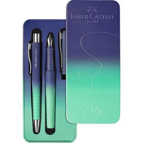 Set cadou ce contine un stilou si un pix Poly Faber-Castell, gama Flow. Forma ergonomica, triunghiulara. Grip placut la atingere, cu textura anti-alunecare. Clip rezistent, varf si buton din metal. Rezerva de mare capacitate, XB, albastra. Corp si componente din plastic reciclat. Varf stilou tip M. Penita din otel inoxidabil. Culoare albastru-turcoaz cu efect gradient.